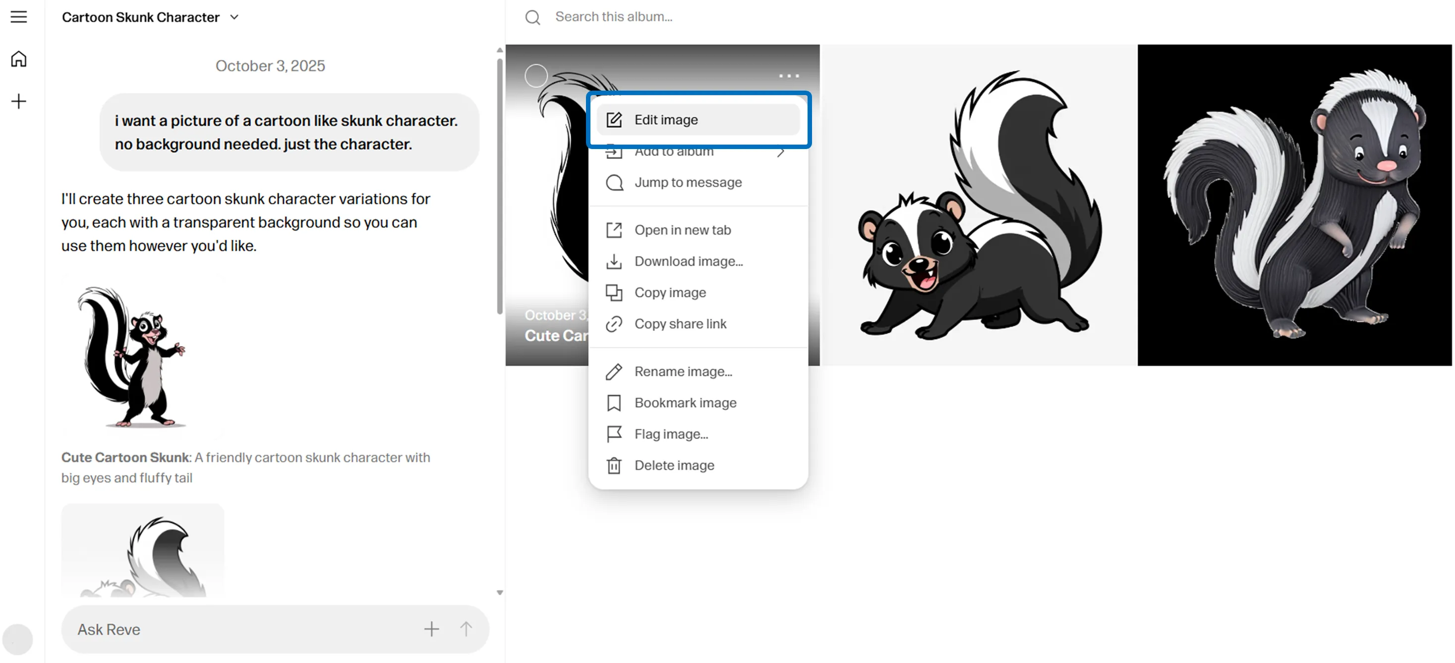 Natural language commands: describe tweaks (e.g., “remove the person on the left,” “add copy that reads ‘Limited Release’”), and Reve applies them.