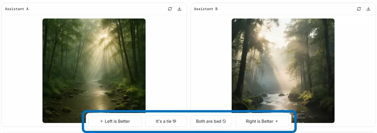 When generation is complete, two images will be displayed. Evaluate which image is superior with buttons like “Left is Better” and “Right is Better”. When you evaluate, the model names used at that time will be displayed. However, Nano Banana is not necessarily chosen, as models are randomly selected. To confirm results using Nano Banana, you need to repeat this process multiple times.