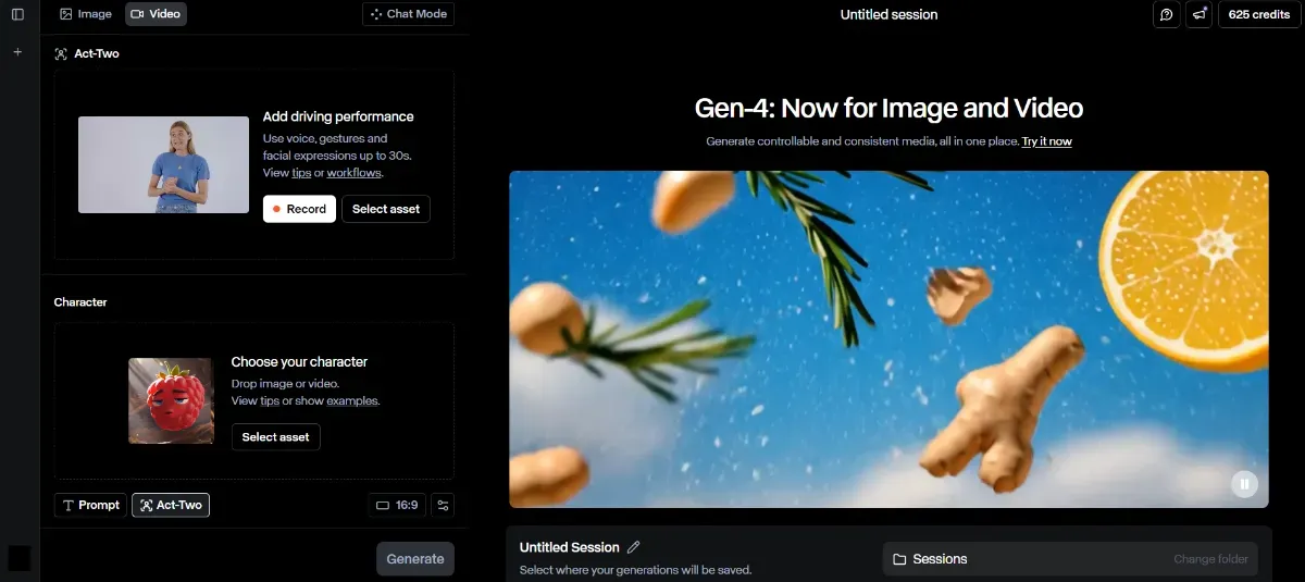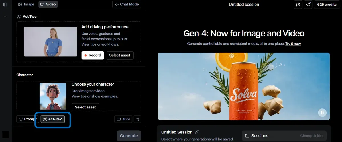 Select “Generate Video” under “Create” on the left side of the dashboard. Choose “Act-Two” at the bottom left of the screen and upload a motion video and Character image or video.