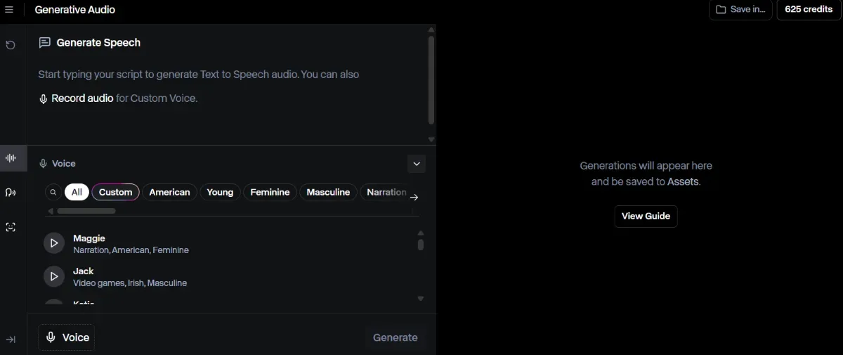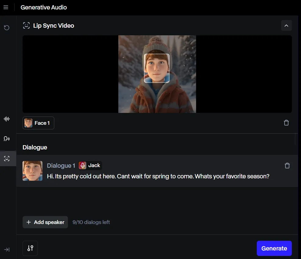 Entering text generates narration at 1 credit per 50 characters, with Pro plans and above supporting custom voice registration. The lip-sync feature automatically adjusts mouth movements to match the generated audio.