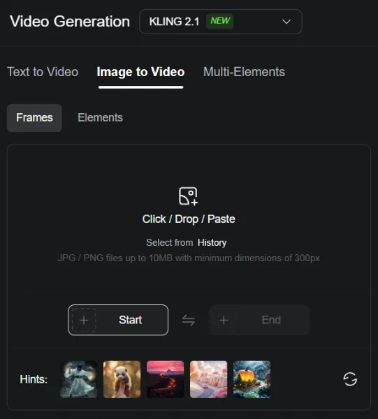 Kling 2.1 では画像入力において「開始時のフレーム(Start Frame)」を指定するができます。終了時のフレーム(End Frame)は現在2.1では対応しておらず、1.6 では Start Frame と End Frame の両方を指定して、動画の始まりと終わりを制御することが可能です。