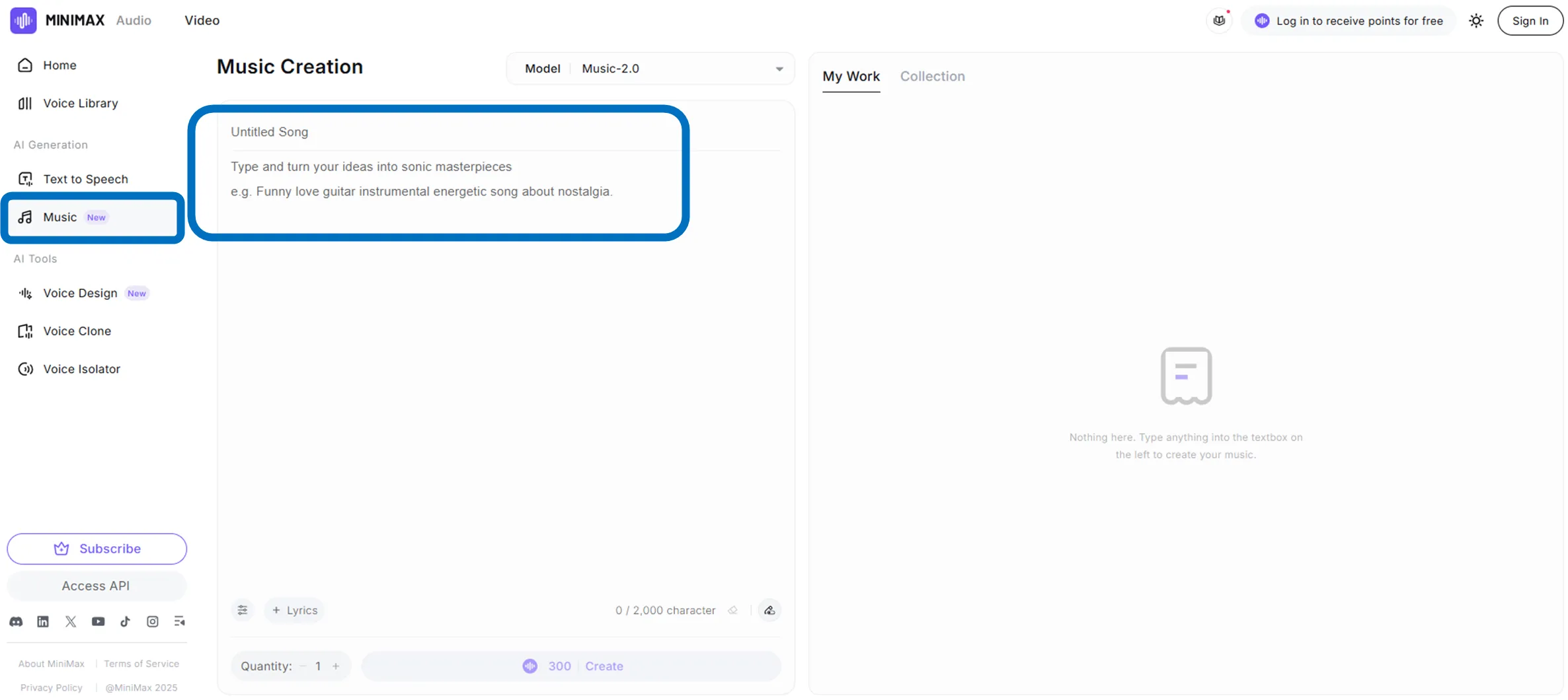 まずMiniMaxの公式サイトにアクセスし、無料アカウントを作成します。ログイン後、ダッシュボードから「Music」を選択しましょう。 テキストボックスに曲のイメージや要望を文章で入力します。